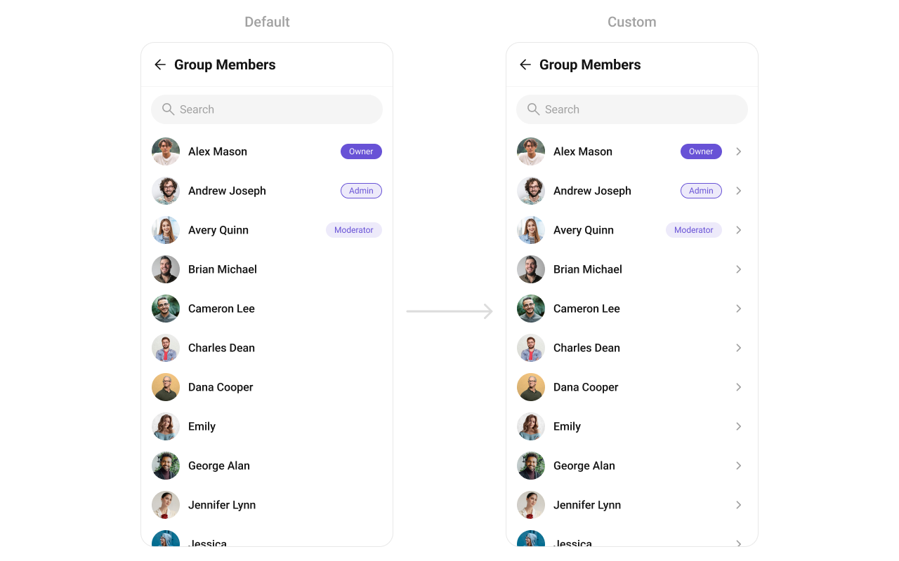 For advanced-level customization, you can set custom views to the component. This lets you tailor each aspect of the component to fit your exact needs and application aesthetics. You can create and define your own views, layouts, and UI elements and then incorporate those into the component. The Group Memebers component does not provide additional functionalities beyond this level of customization.