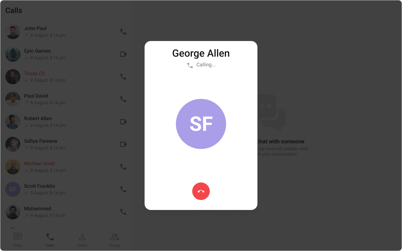 This prop renders the custom cancel-call button view for the outgoing call. Use this to override the existing cancel call button view from the outgoing call. The customized chat interface is displayed below.