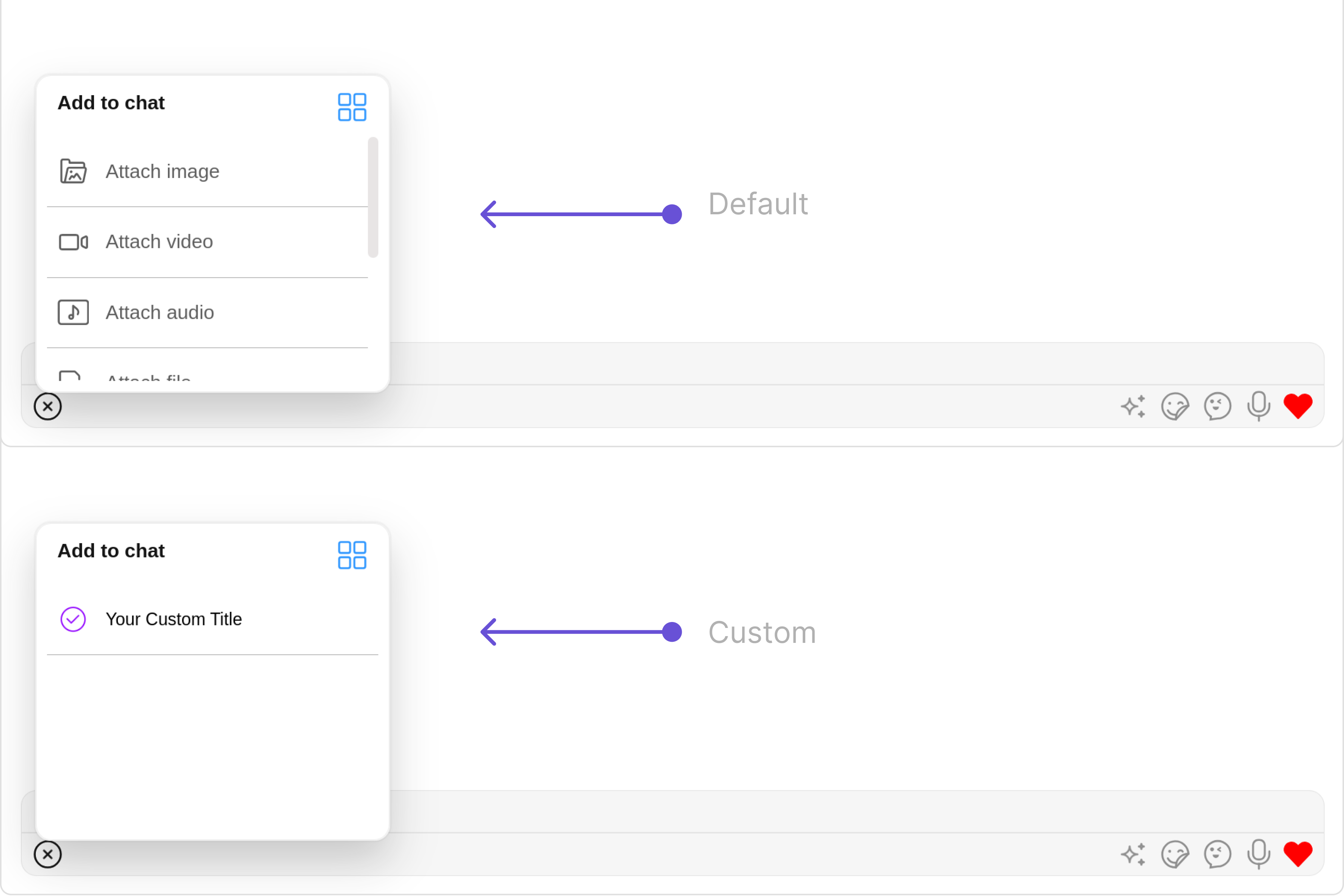 For advanced-level customization, you can set custom views to the component. This lets you tailor each aspect of the component to fit your exact needs and application aesthetics. You can create and define your views, layouts, and UI elements and then incorporate those into the component.AttachmentOptions