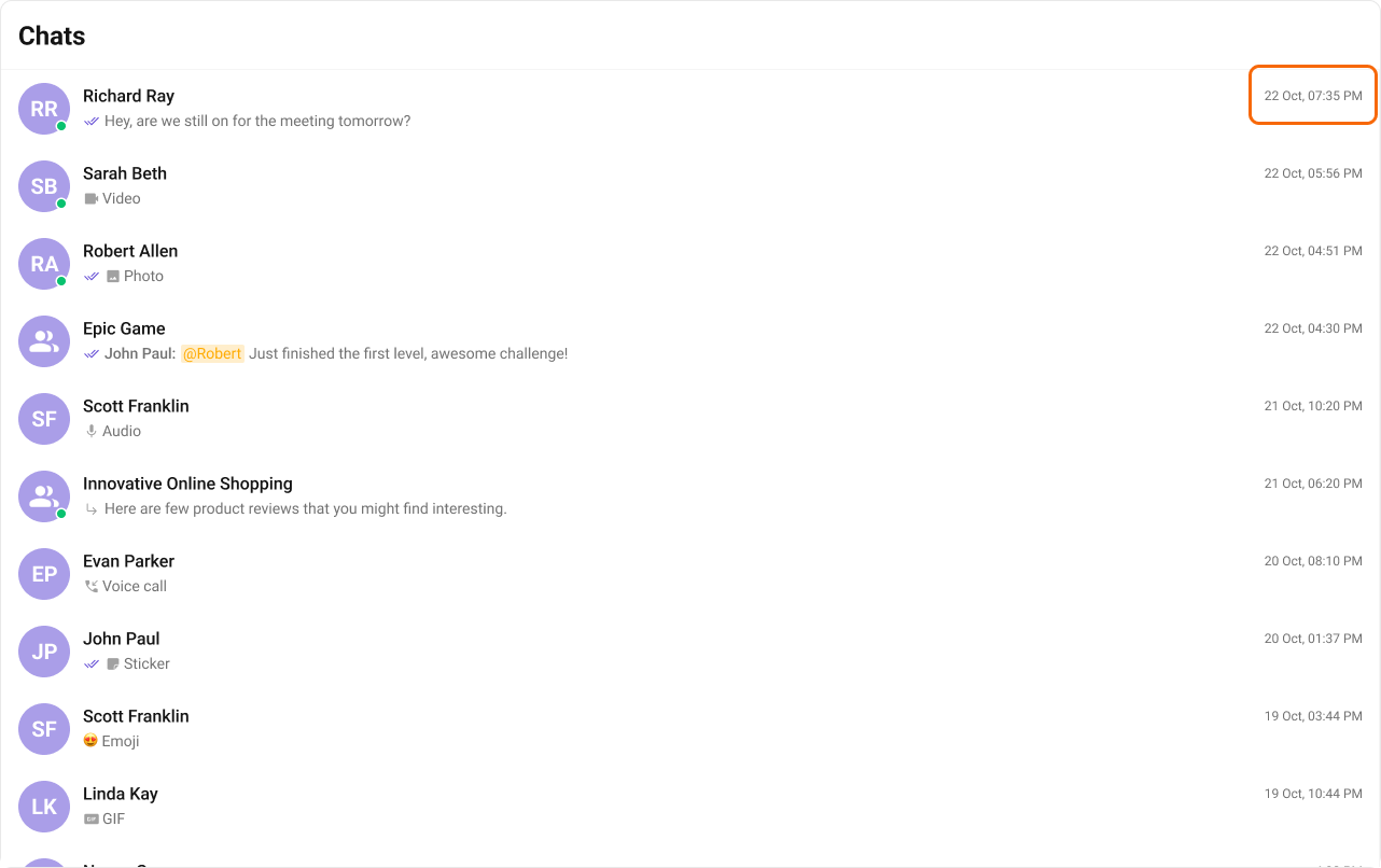 | DayDateTime | Date format displayed in the following format.1) If timestamp < 24hrs display “hh:mm a” 2) If timestamp < 48hrs display “Yesterday” 3) If timestamp < 7days display “EEE” i.e SUNDAY 4) else display “dd MM yyyy” |